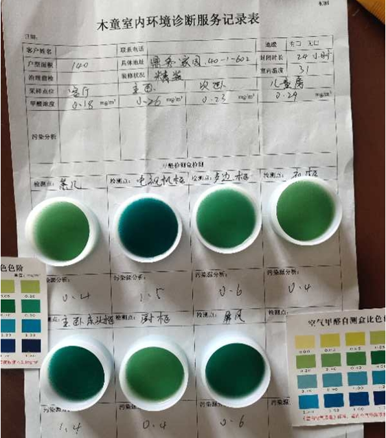 業(yè)主家新裝修完6個多月,入住時感覺有明顯不適的異味,身體不舒服,懷疑是裝修污染造成。通過查詢對比,找到濟南木童來為其提供室內(nèi)除甲醛服務(wù)。經(jīng)木童工程師上門診斷,確定業(yè)主家主要甲醛污染來源于裝修中使用的家具內(nèi),需要采用木童人造板甲醛清除劑——強力除醛劑第三代、家具甲醛清除劑等進行治理。異味來源于油漆家具以及生態(tài)板家具上采用木童家具除味劑進行全面徹底治理。